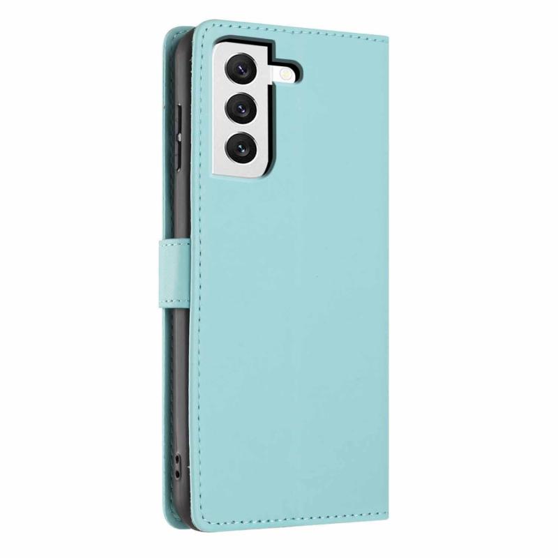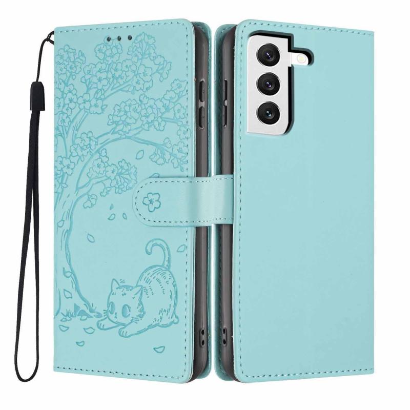 For Samsung Galaxy S22+ 5G Tree Cat Embossed Flip Vegan Leather Phone Case(Light Green)