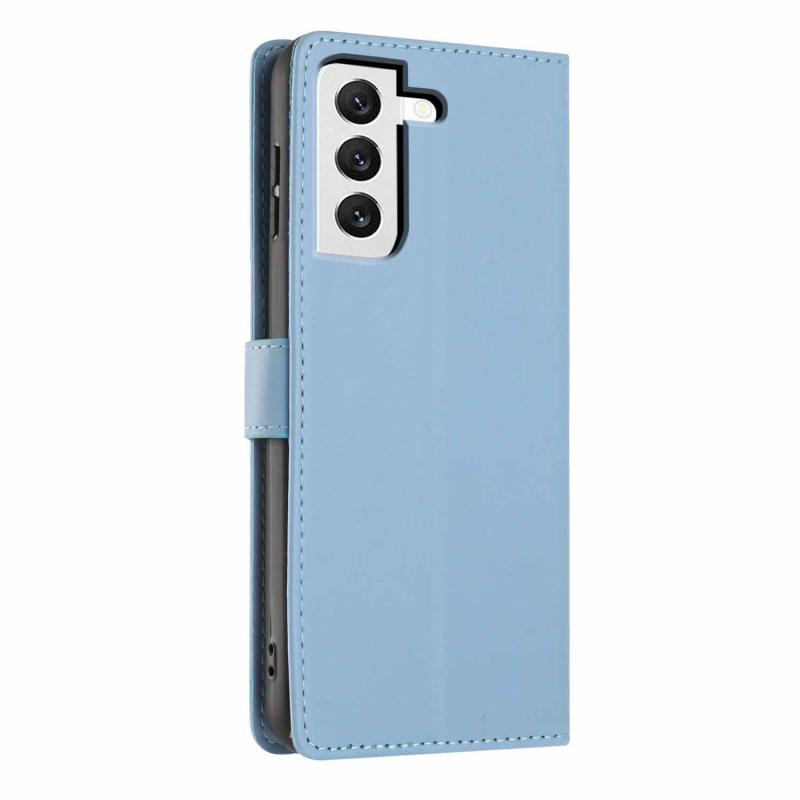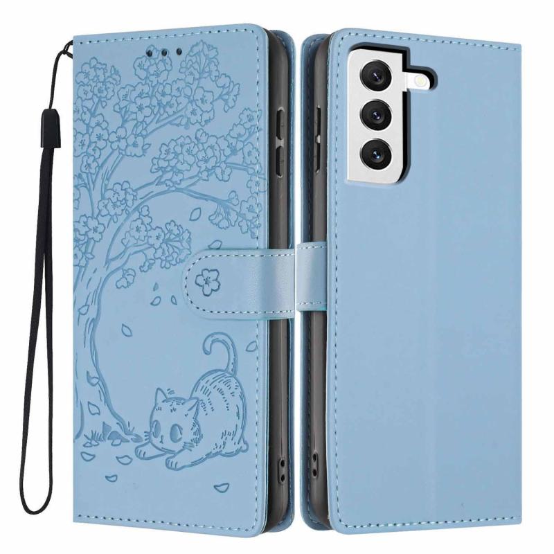 For Samsung Galaxy S22+ 5G Tree Cat Embossed Flip Vegan Leather Phone Case(Sky Blue)