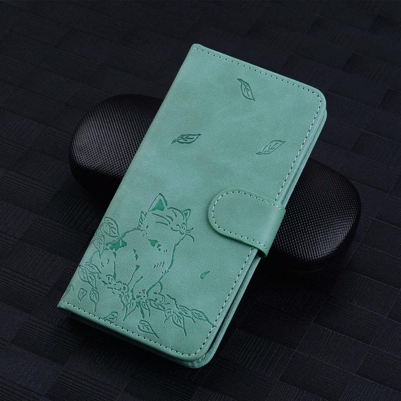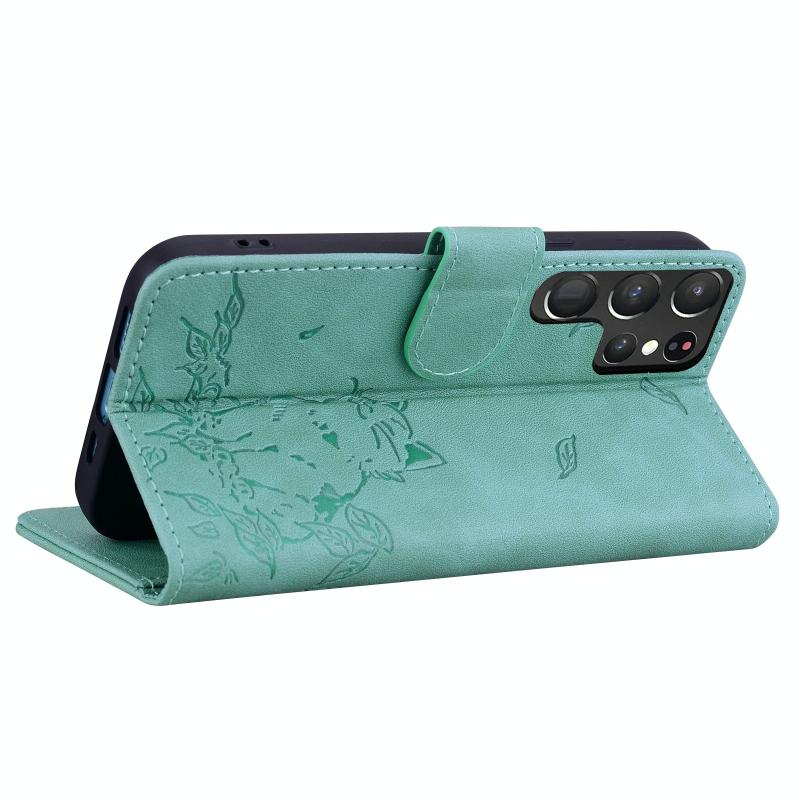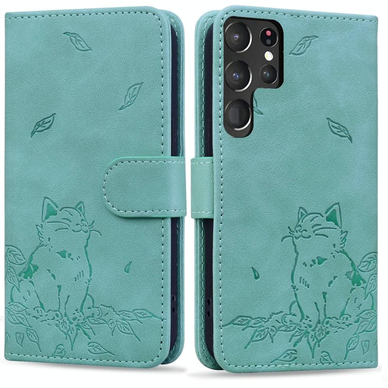 For Samsung Galaxy S22 Ultra 5G Cute Cat Embossed Leather Phone Case(Green)