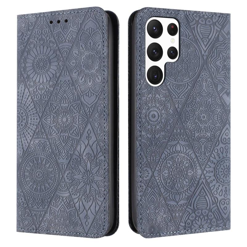 For Samsung Galaxy S22 Ultra 5G Ethnic Embossed Adsorption Leather Phone Case(Grey)