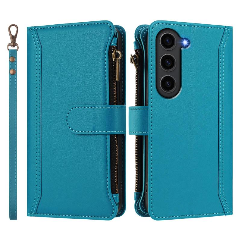 For Samsung Galaxy S23 FE 5G Magnetic Closure 9 Card Slots Zipper Leather Case with Hand Strap(Turquoise)