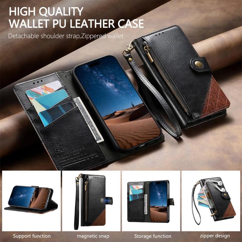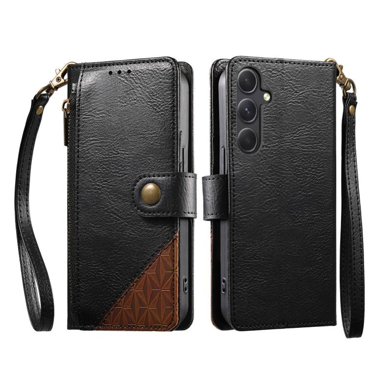For Samsung Galaxy S23 FE 5G Splicing Zipper Wallet Vegan Leather Phone Case with Strap(Black)
