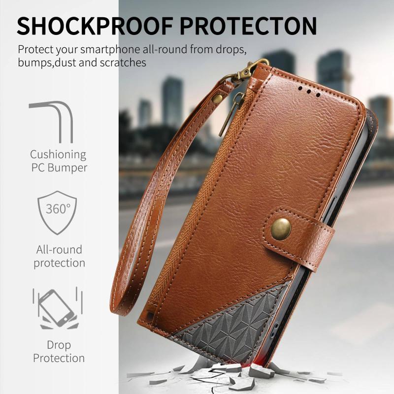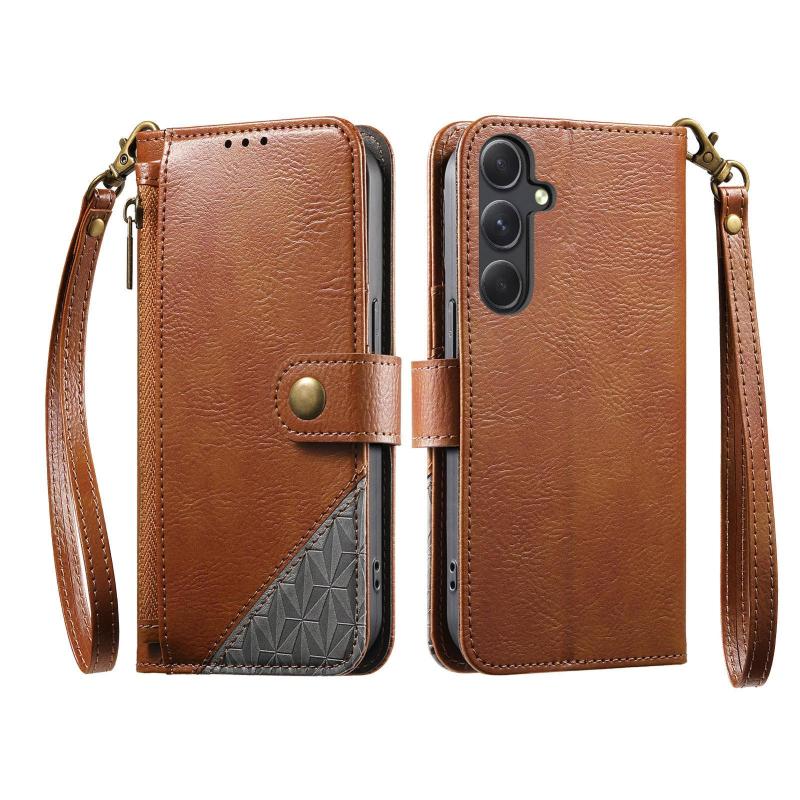 For Samsung Galaxy S23 FE 5G Splicing Zipper Wallet Vegan Leather Phone Case with Strap(Brown)