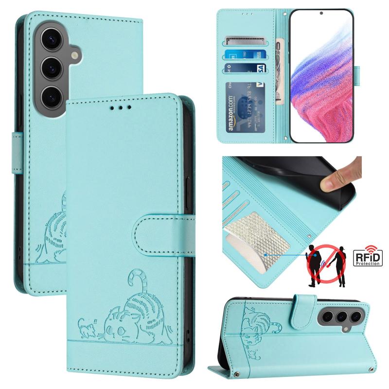 For Samsung Galaxy S24+ 5G Cat Rat Embossed Pattern RFID Leather Phone Case with Lanyard(Mint Green)