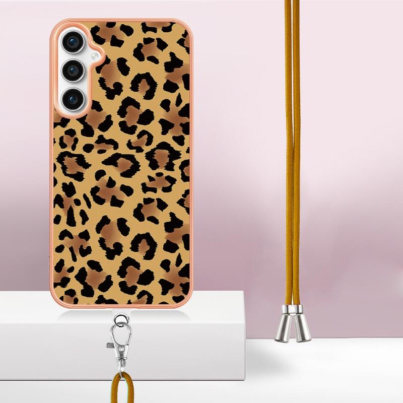 For Samsung Galaxy S24 FE 5G Electroplating Dual-side IMD Phone Case with Lanyard(Leopard Print)