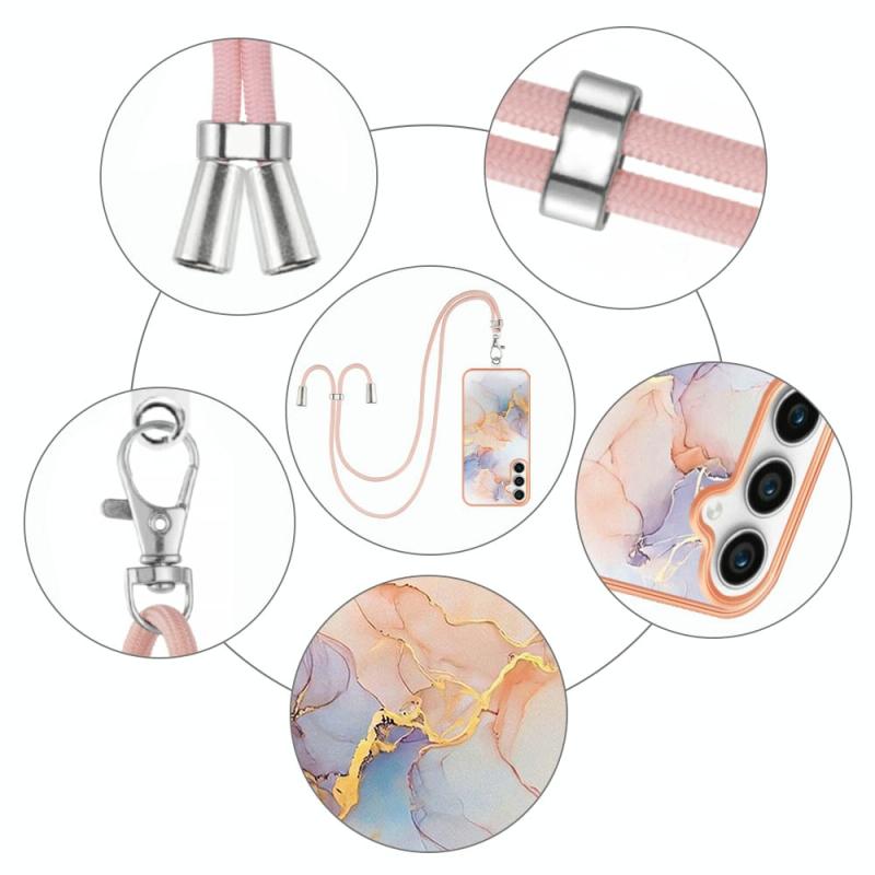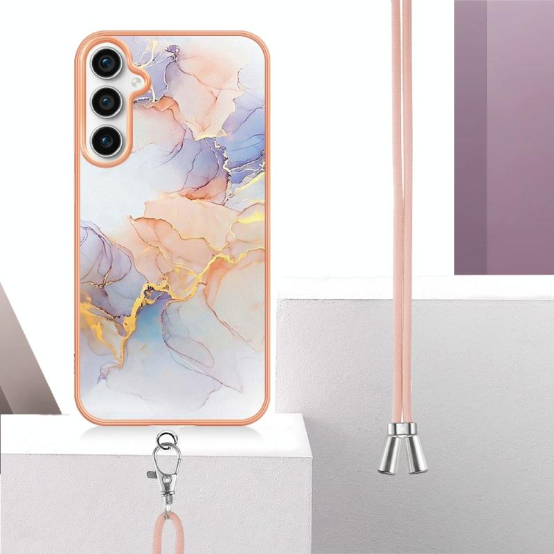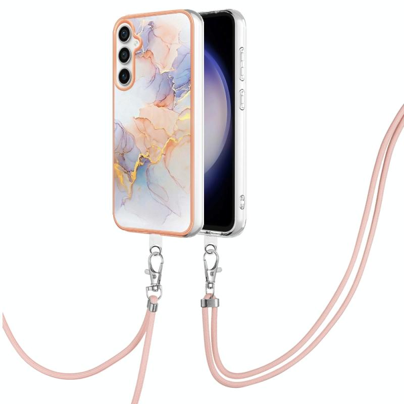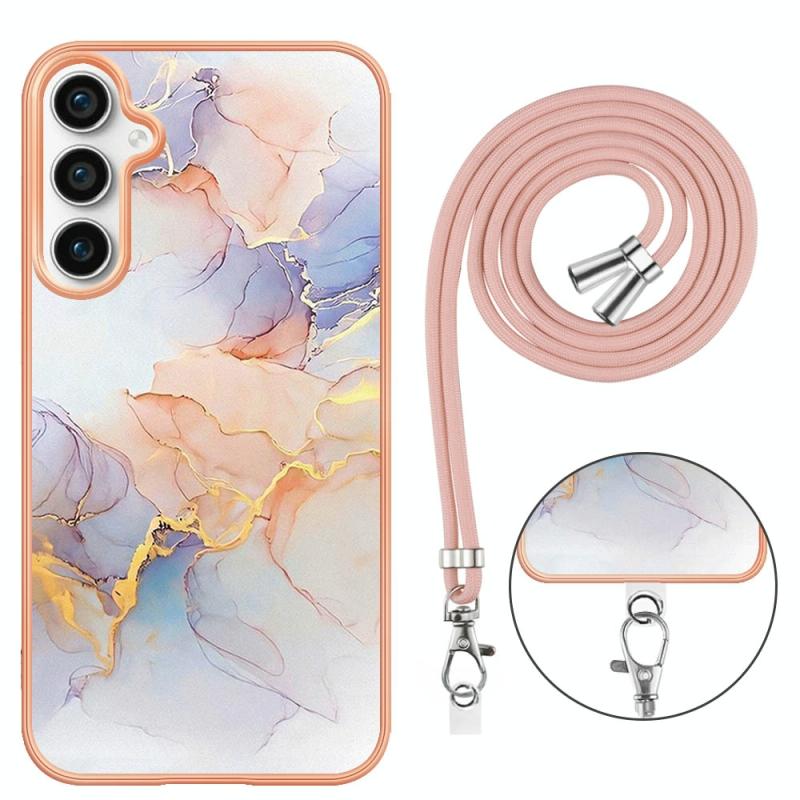 For Samsung Galaxy S24 FE 5G Electroplating Pattern IMD TPU Shockproof Case with Neck Lanyard(Milky Way White Marble)
