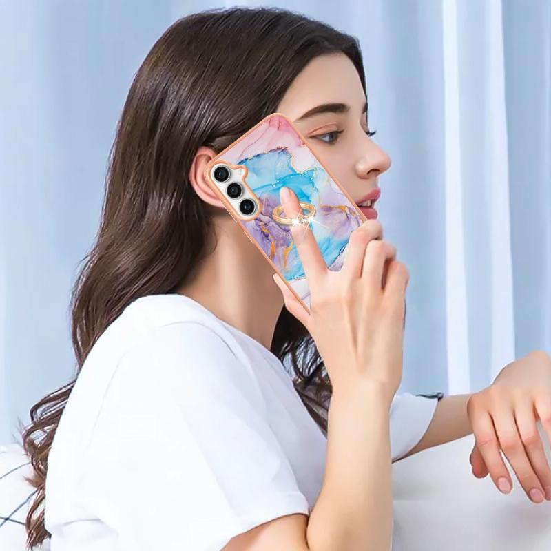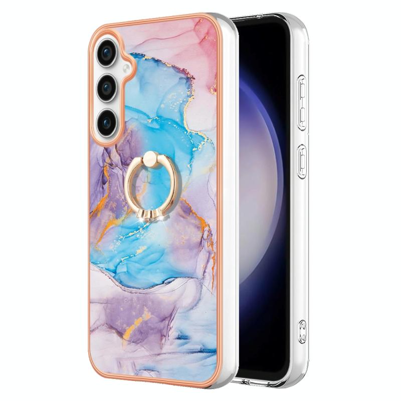 For Samsung Galaxy S24 FE 5G Electroplating Pattern IMD TPU Shockproof Case with Rhinestone Ring Holder(Milky Way Blue Marble)