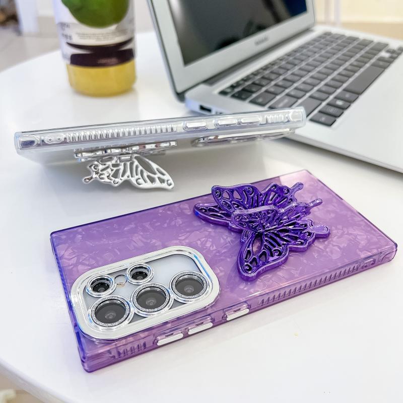 For Samsung Galaxy S24 FE 5G Plating Glitter Texture Butterfly Holder TPU Phone Case with Lens Film(White Water Ripples)