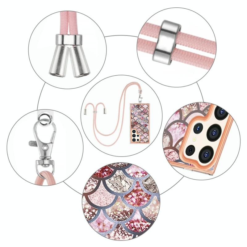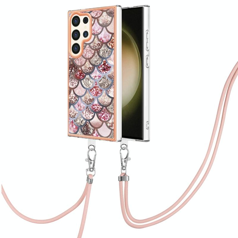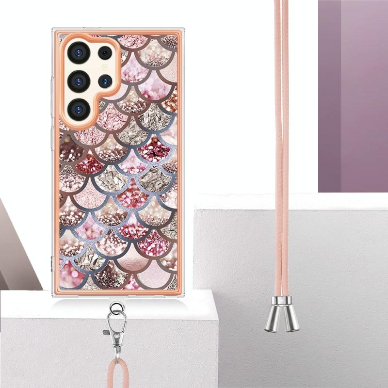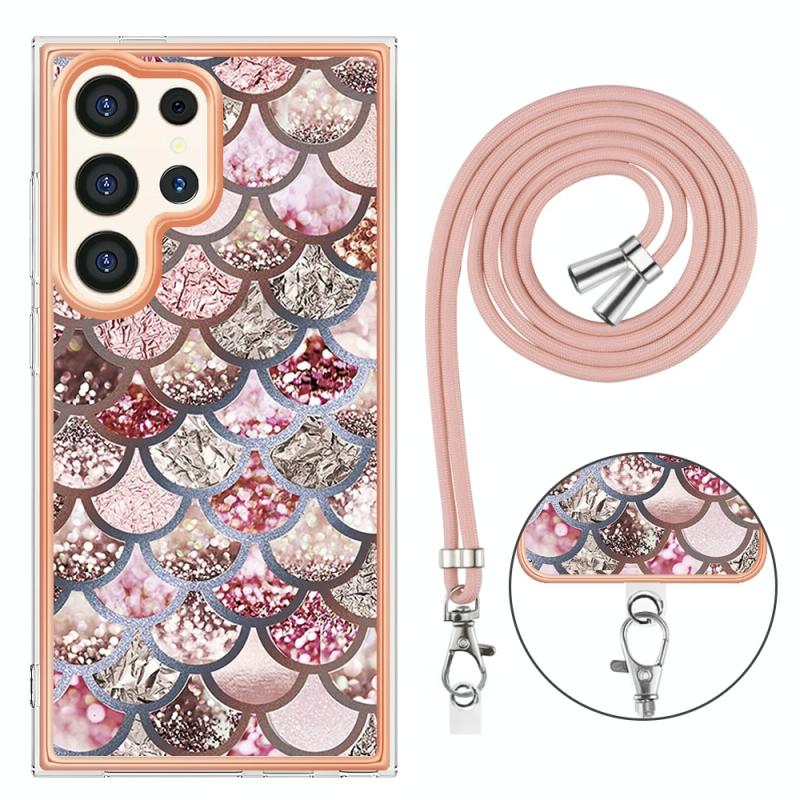 For Samsung Galaxy S24 Ultra 5G Electroplating Pattern IMD TPU Shockproof Case with Neck Lanyard(Pink Scales)