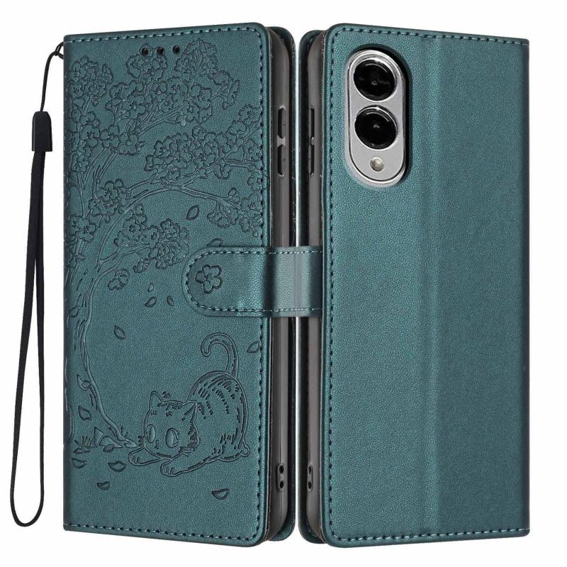 For Samsung Galaxy S25 Edge 5G Tree Cat Embossed Flip Vegan Leather Phone Case(Deep Green)