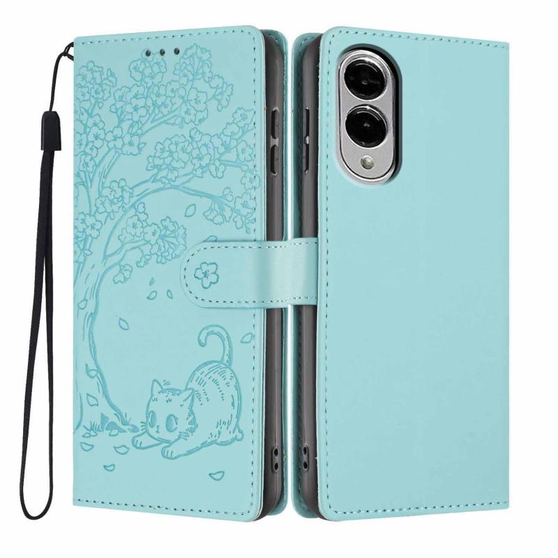 For Samsung Galaxy S25 Edge 5G Tree Cat Embossed Flip Vegan Leather Phone Case(Light Green)