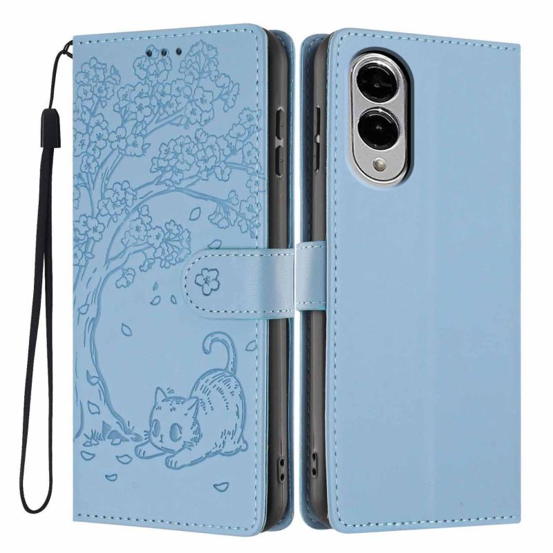 For Samsung Galaxy S25 Edge 5G Tree Cat Embossed Flip Vegan Leather Phone Case(Sky Blue)