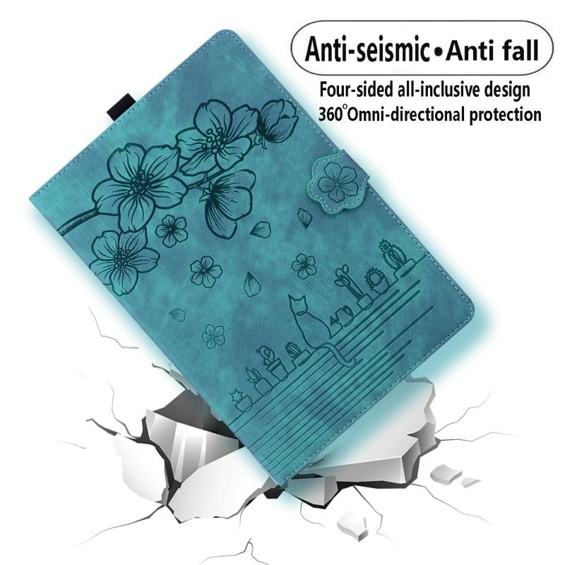 For Samsung Galaxy Tab A9+ Cartoon Sakura Cat Embossed Leather Tablet Case(Green)