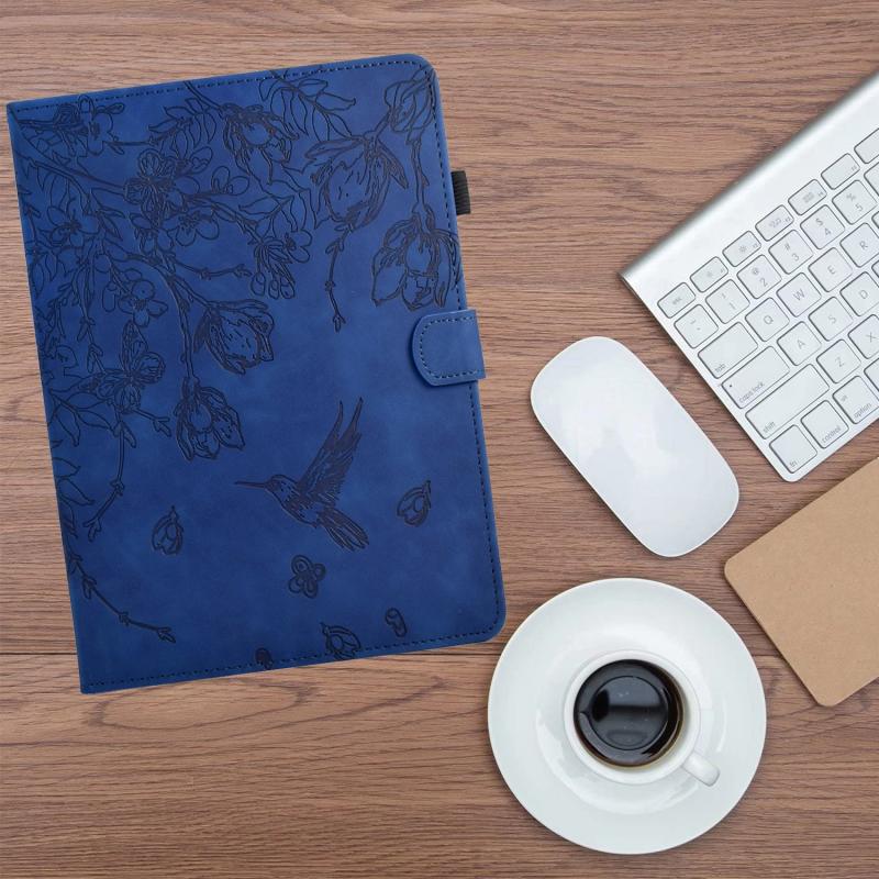 For Samsung Galaxy Tab A9 Flowers and Bird Embossed Leather Tablet Case(Dark Blue)