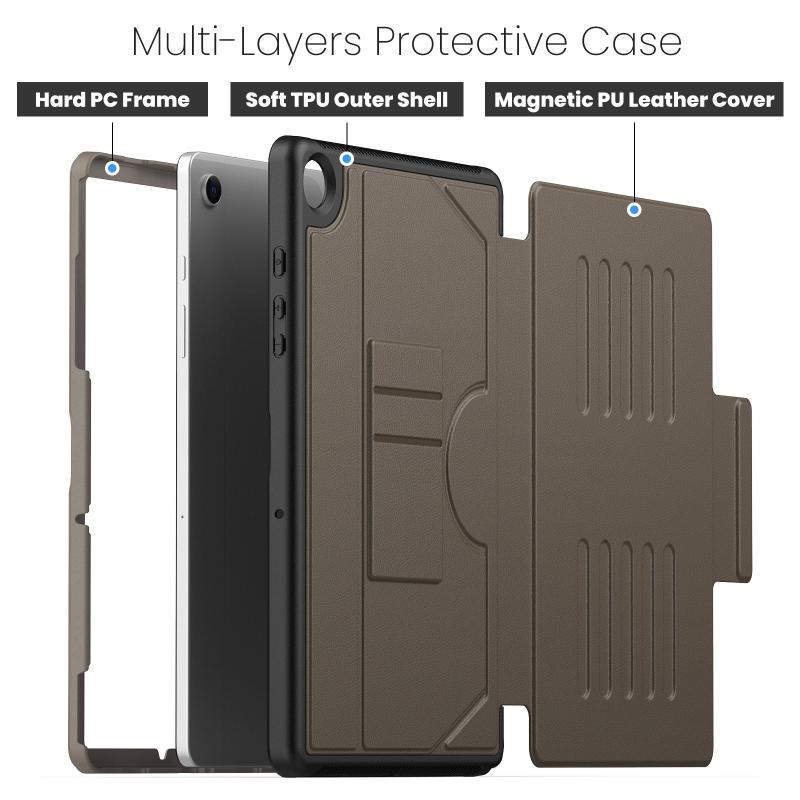 1. Durable Material: Magnetic case made of high quality PC + TPU and premium textured faux leather material, slim and lightweight design with excellent craftsmanship and feel. Prevents the tablet from scratching and bumping, fingerprints and dust. Also easy to clean.