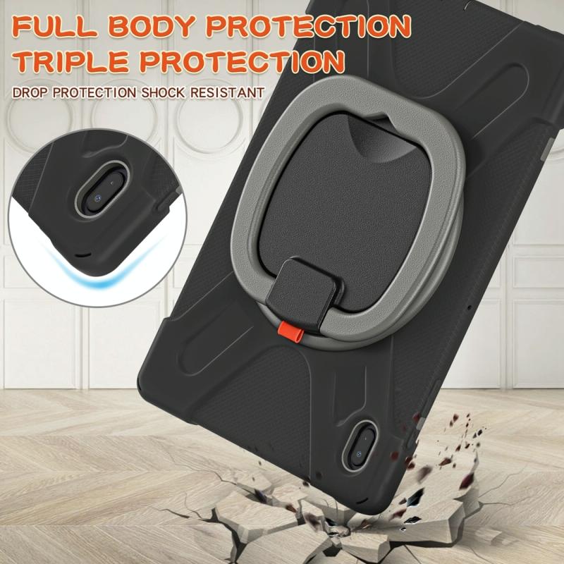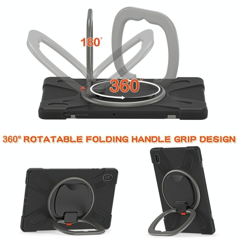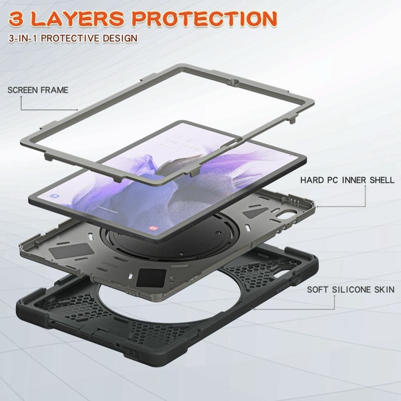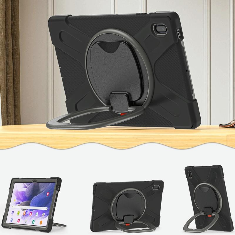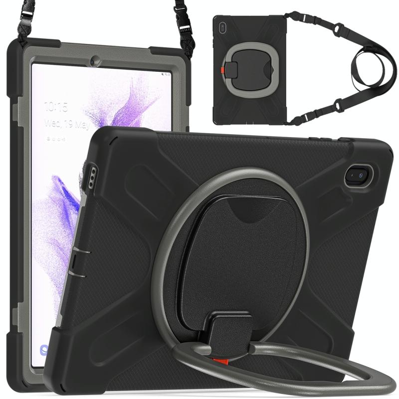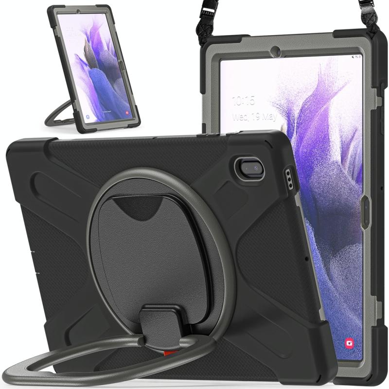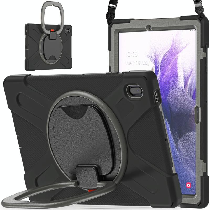 For Samsung Galaxy Tab S7 FE T730 Silicone + PC Protective Case with Holder & Shoulder Strap(Black+Grey)