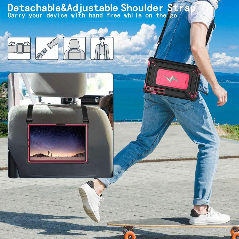 6. Detachable Shoulder Strap: The adjustable hand strap provides easy and comfortable grip, a must-have feature when you are presenting your tablet to others. The detachable and adjustable shoulder strap can help you carry your tablet more safely while hiking, traveling and other outdoor activities. This can also be used to secure your tablet to the car seat.