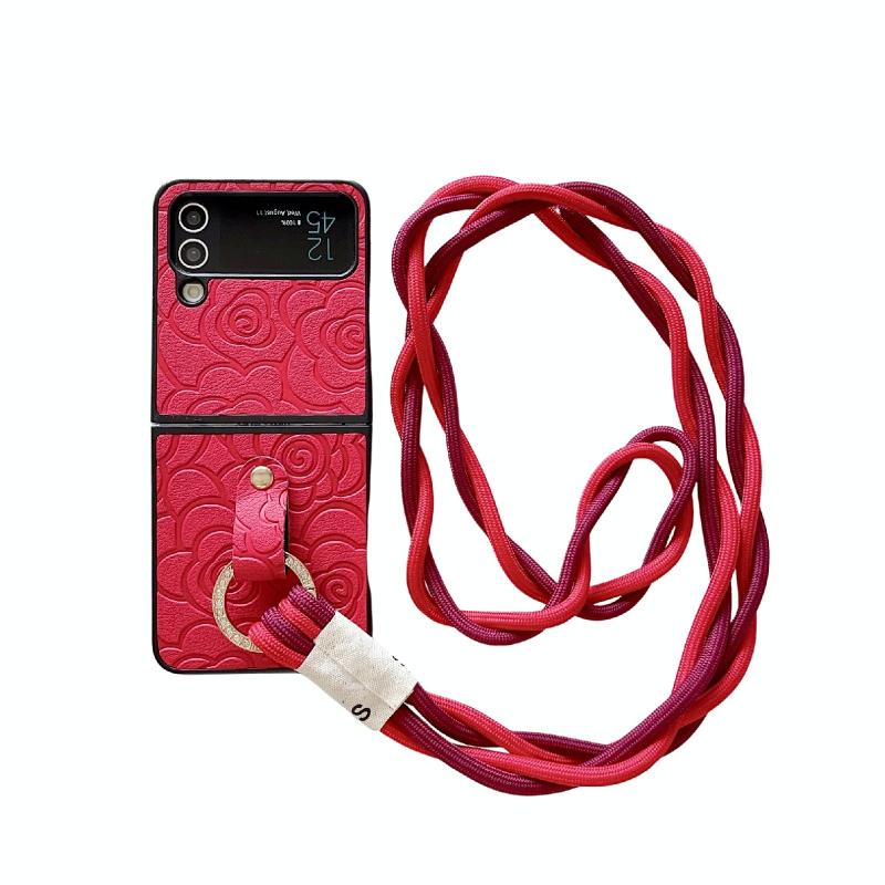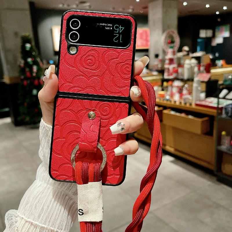 For Samsung Galaxy Z Flip4 5G Impression Camellia Pattern Protective Phone Case with Diamond Ring Long Lanyard(Red)