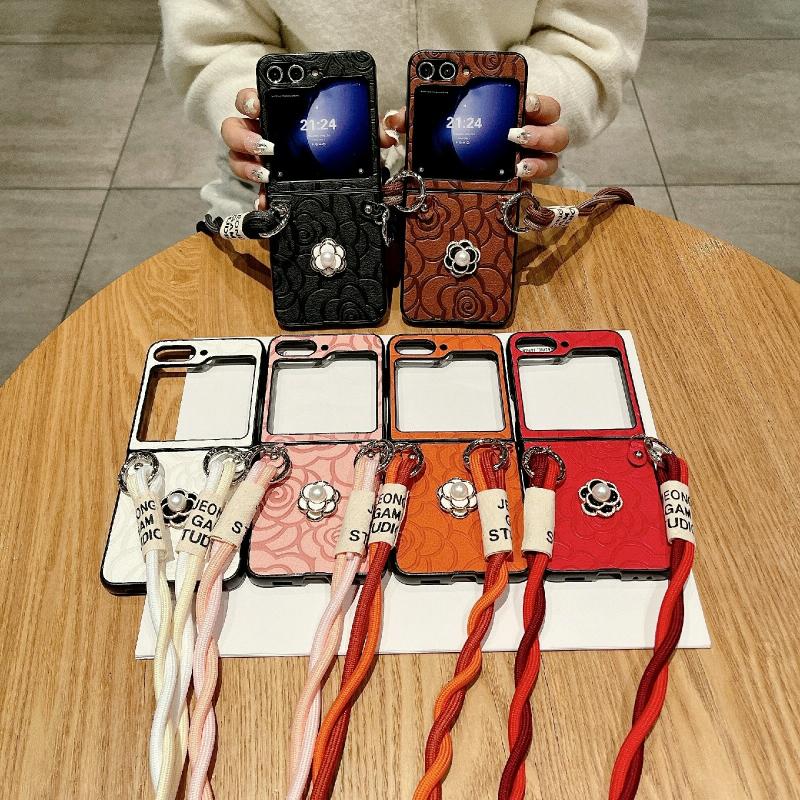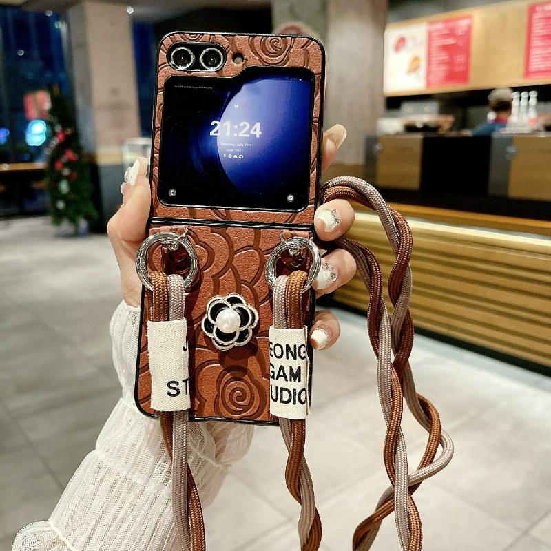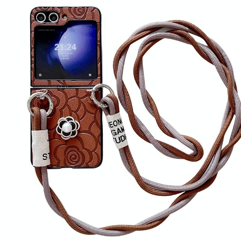 For Samsung Galaxy Z Flip4 5G Impression Camellia Pattern Protective Phone Case with Long Lanyard(Brown)
