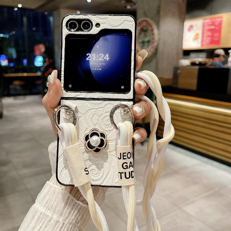 For Samsung Galaxy Z Flip4 5G Impression Camellia Pattern Protective Phone Case with Long Lanyard(White)