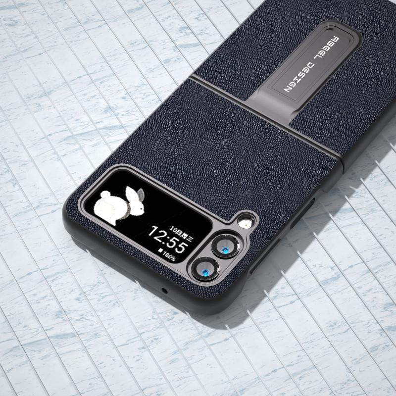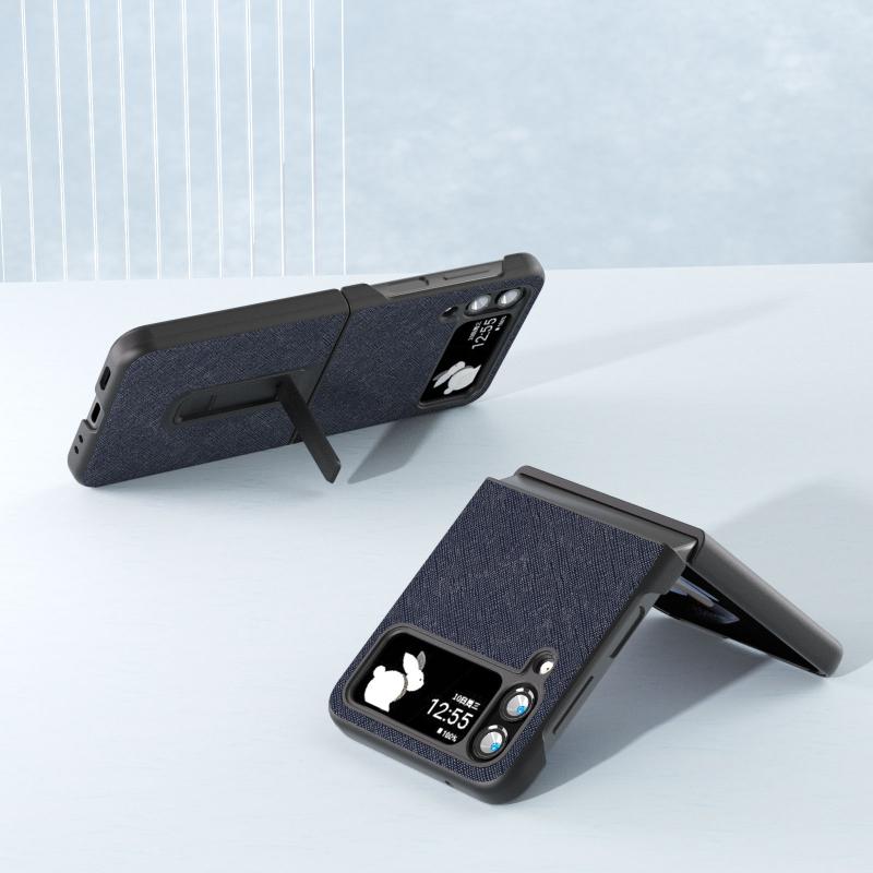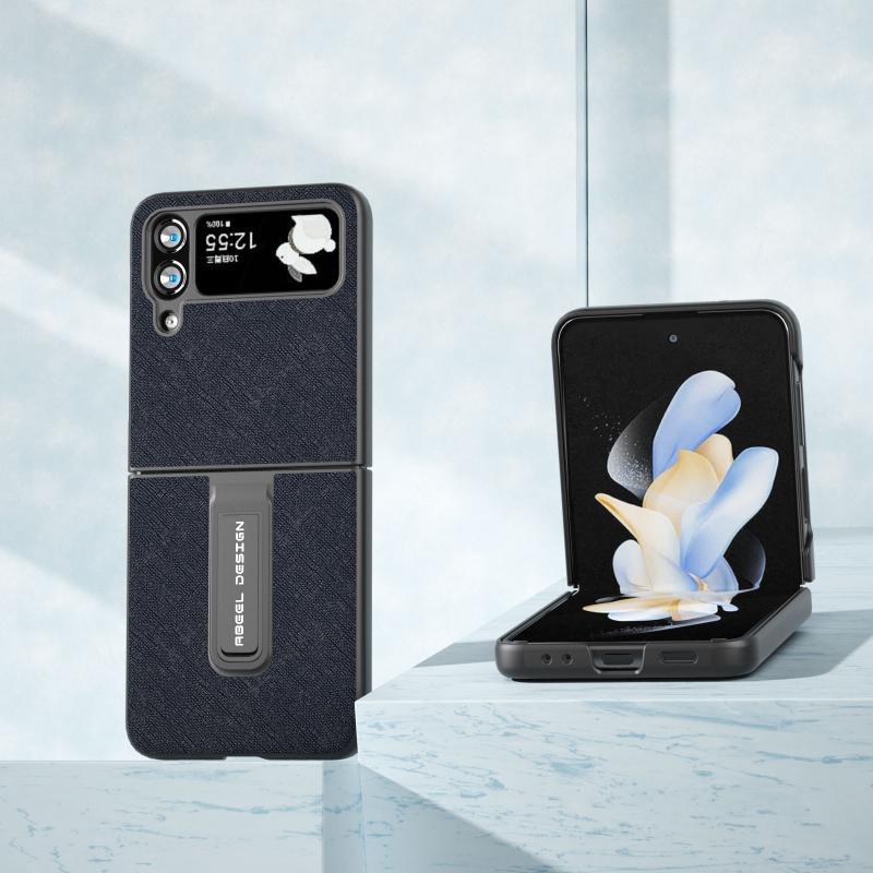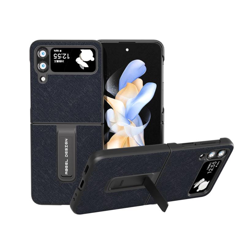 For Samsung Galaxy Z Flip4 Cross Texture Genuine Leather Phone Case with Holder(Blue)