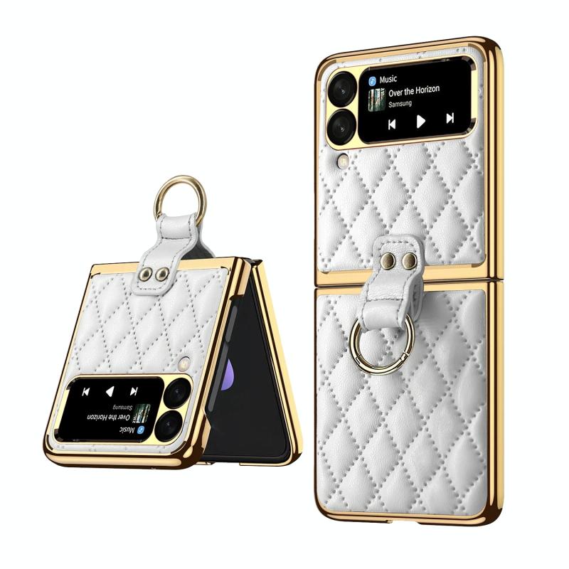For Samsung Galaxy Z Flip4 Diamond Lattice Plain Leather Ring Phone Case(White)