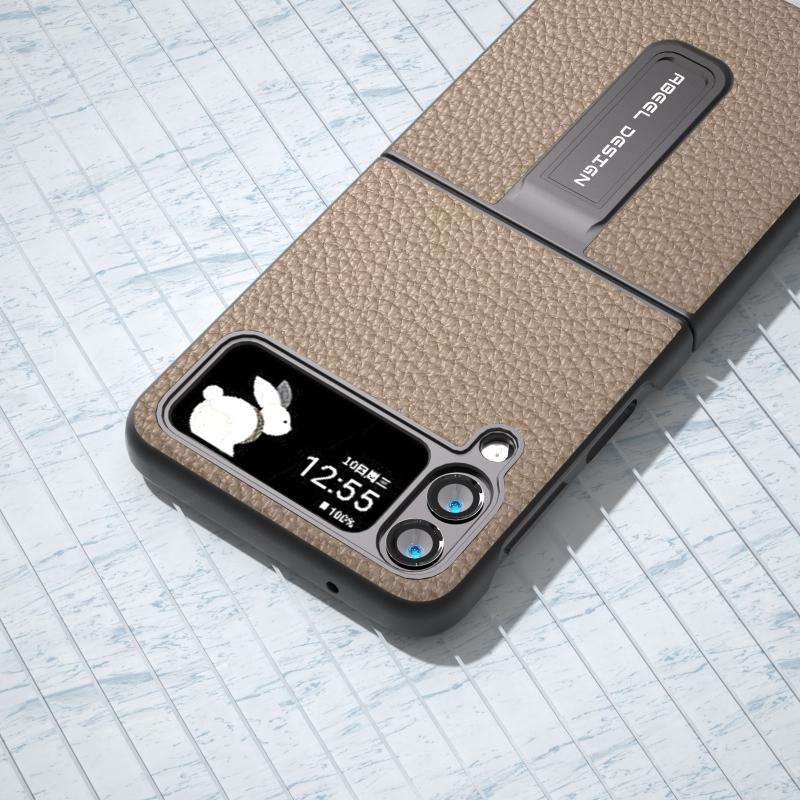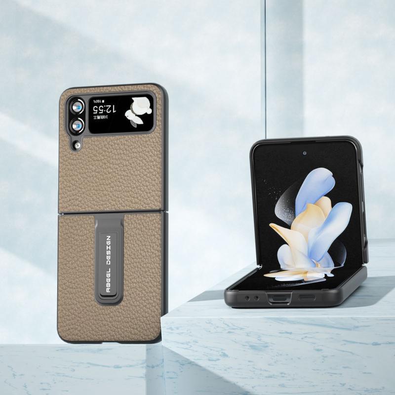 For Samsung Galaxy Z Flip4 Genuine Leather Litchi Texture Phone Case with Holder(Grey)