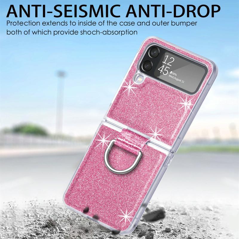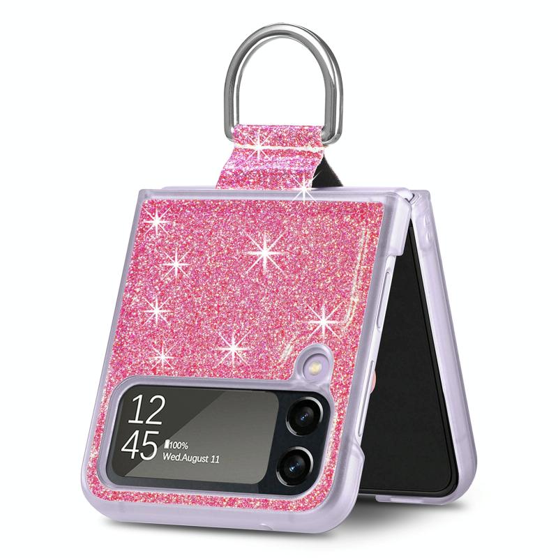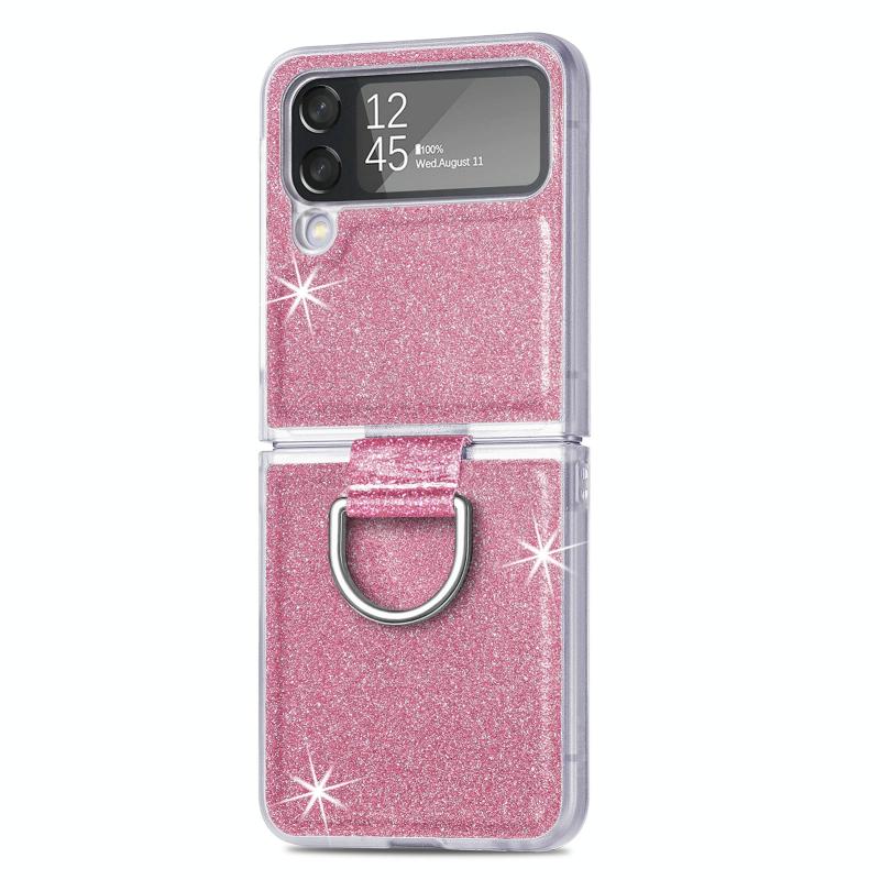 For Samsung Galaxy Z Flip4 Glitter Leather Skin PC Phone Case with Ring(Pink)