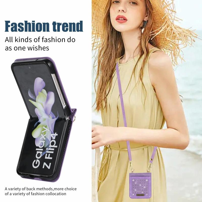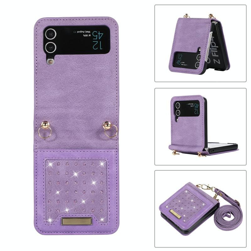 For Samsung Galaxy Z Flip4 Three-fold RFID Leather Phone Case with Lanyard(Purple)