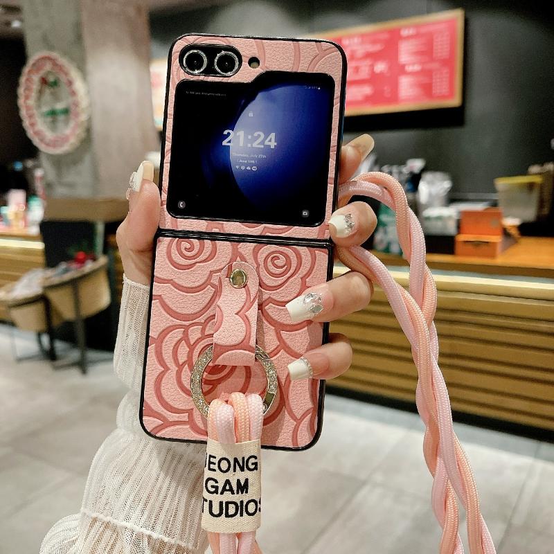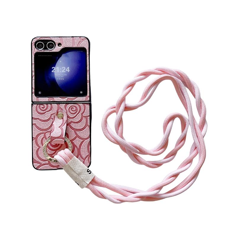 For Samsung Galaxy Z Flip5 5G Impression Camellia Pattern Protective Phone Case with Diamond Ring Long Lanyard(Pink)