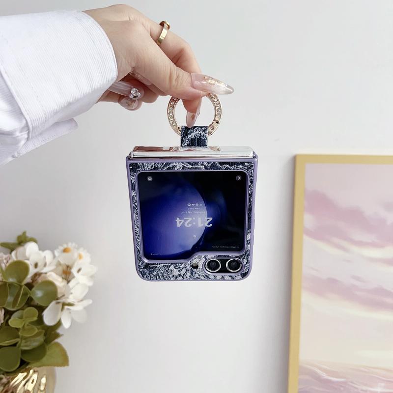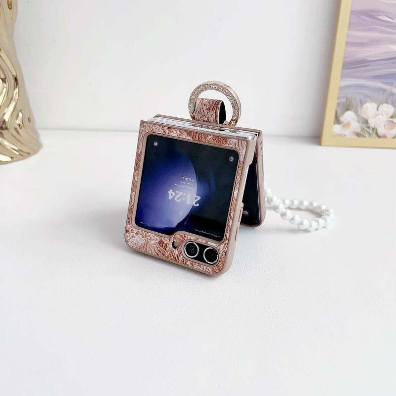 For Samsung Galaxy Z Flip5 Embroidery Style Full Coverage Phone Case with Ring Bead Chain(Orange)