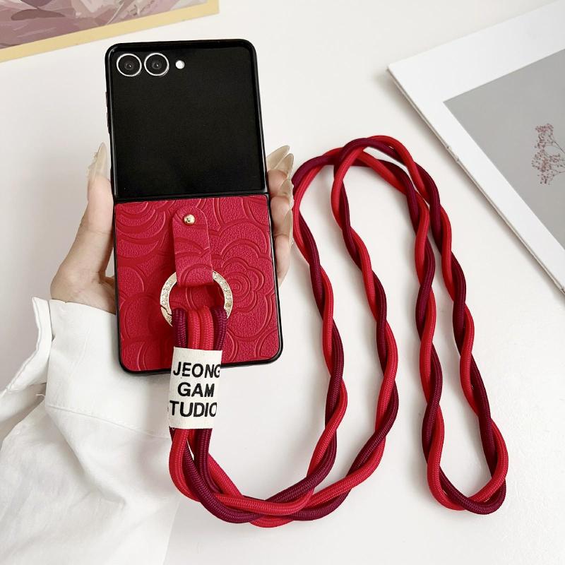 For Samsung Galaxy Z Flip7 5G Impression Camellia Pattern Protective Phone Case with Diamond Ring Long Lanyard(Red)