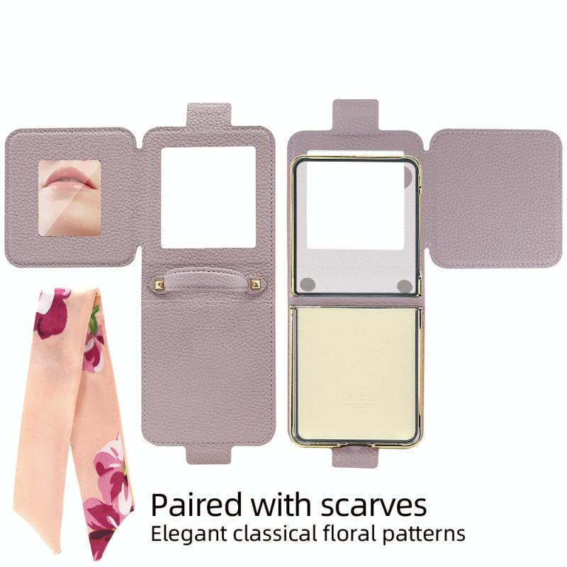 For Samsung Galaxy Z Flip7 Litchi Pattern Makeup Mirror PU Phone Case with Silk Scarf(Beige)