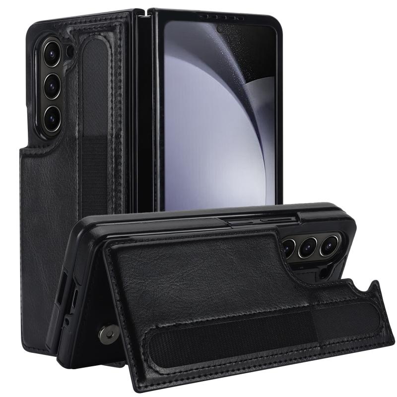 For Samsung Galaxy Z Fold5 Full Coverage Fold Double Buckle PU Phone Case with Pen Slots(Black)
