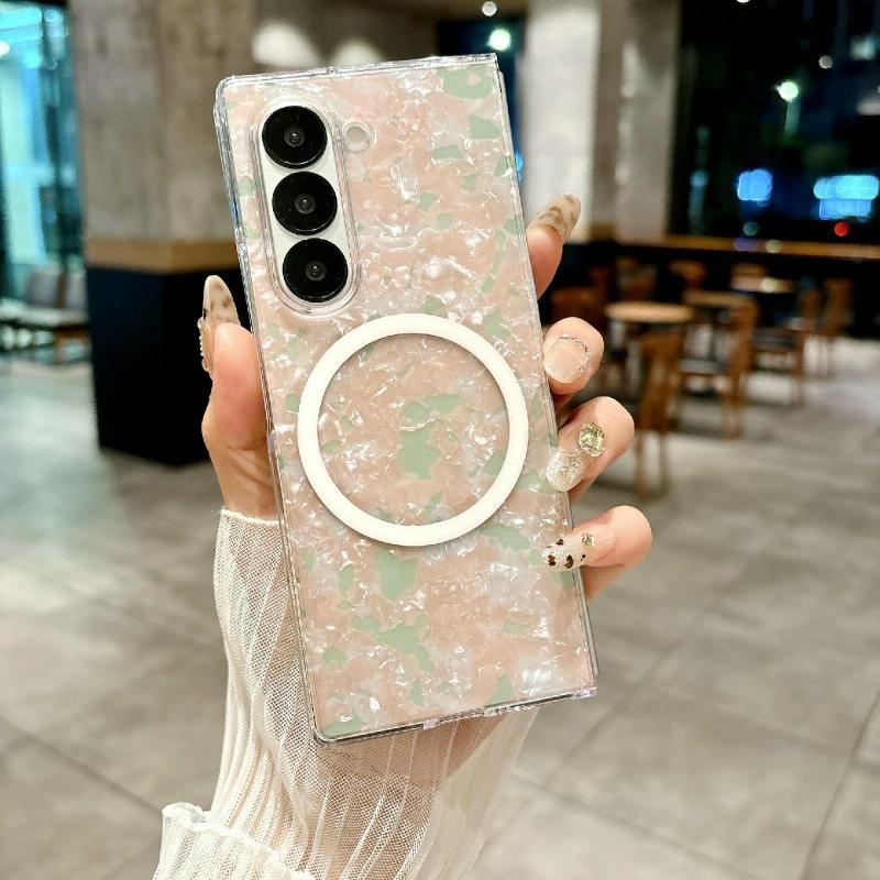 For Samsung Galaxy Z Fold5 Pearlescent Shell Texture MagSafe Phone Case(Pink Green)