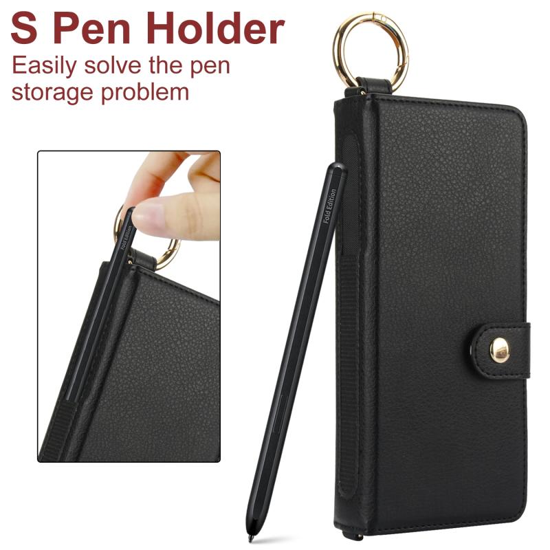For Samsung Galaxy Z Fold5 Solid Color Wristband Ring RFID Leather Phone Case with Lanyard(Black)
