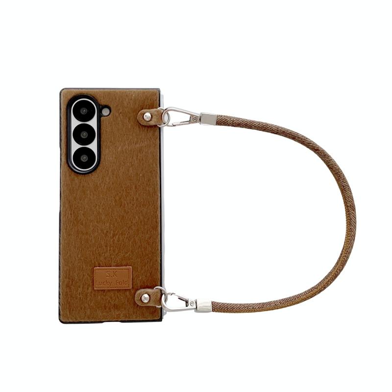For Samsung Galaxy Z Fold6 5G Comfortable Short Plush Full Coverage Phone Case with Wrist Strap(Brown)