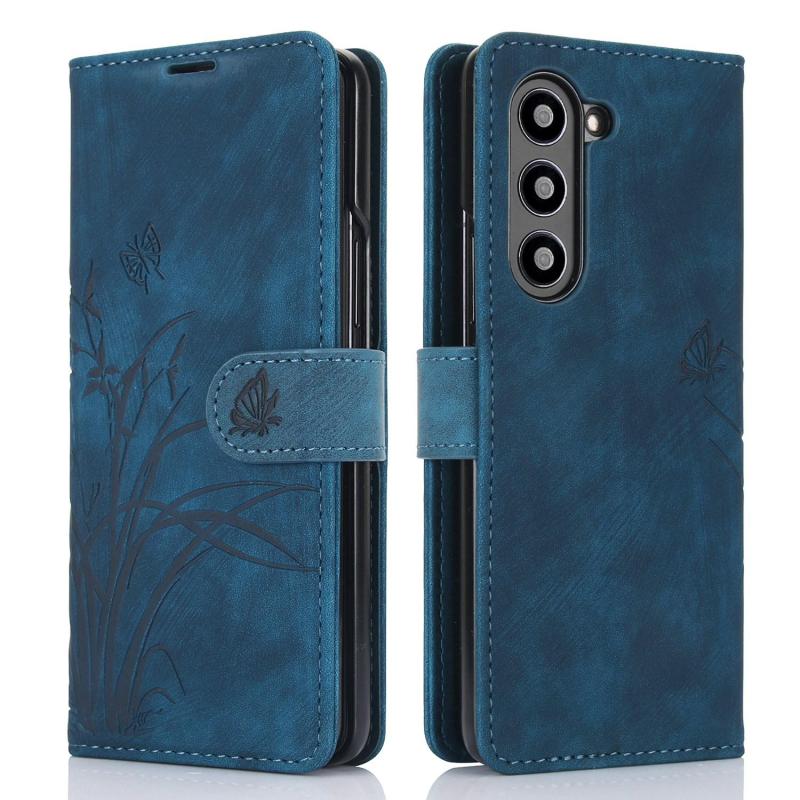 For Samsung Galaxy Z Fold6 Orchid Butterfly Embossed Leather Phone Case(Blue)