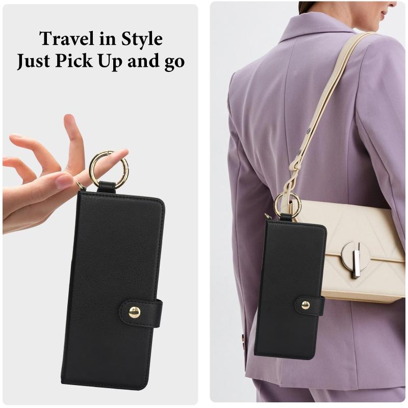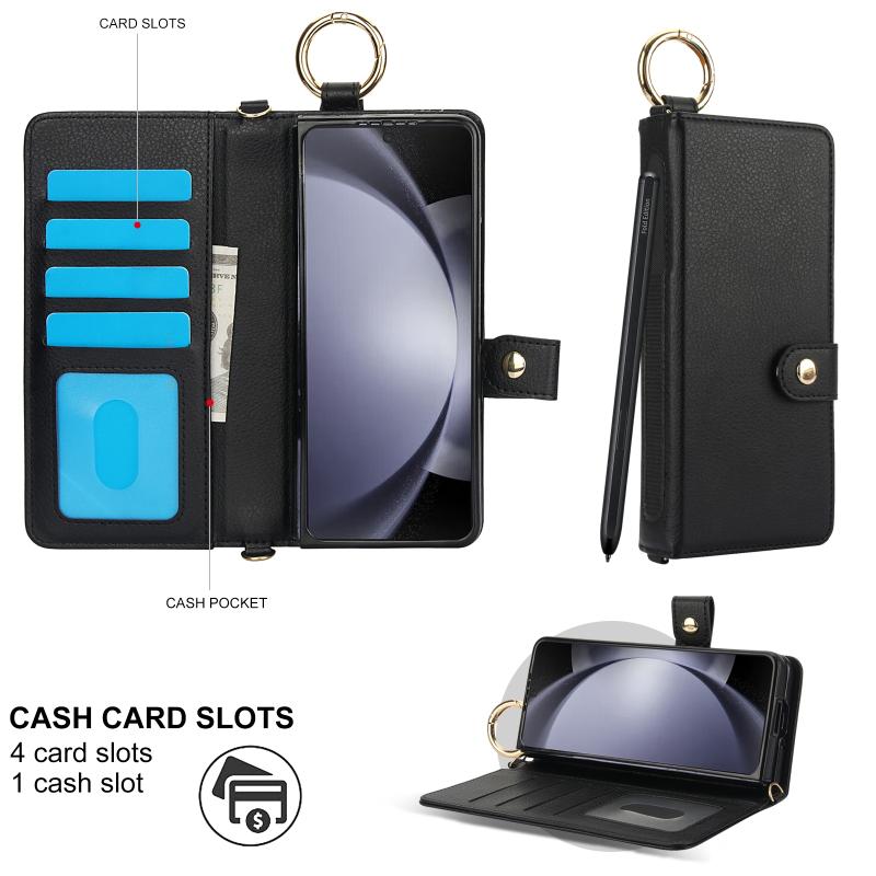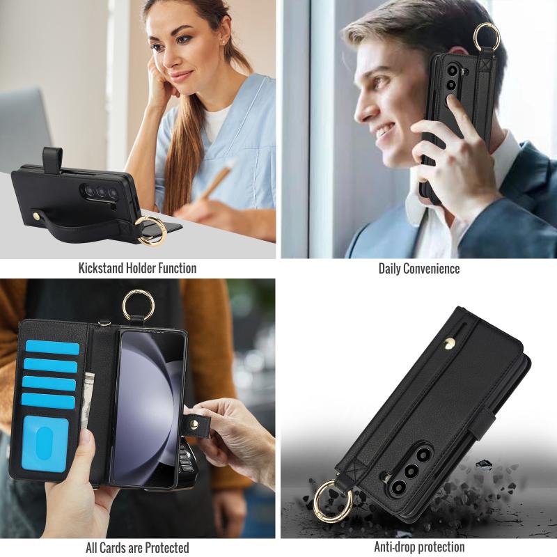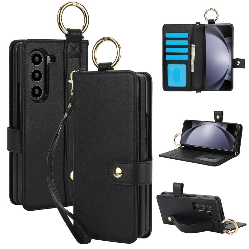 For Samsung Galaxy Z Fold6 Solid Color Wristband Ring RFID Leather Phone Case with Lanyard(Black)