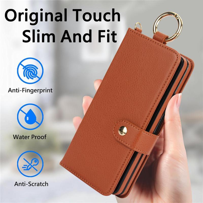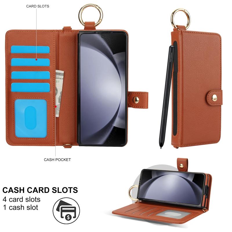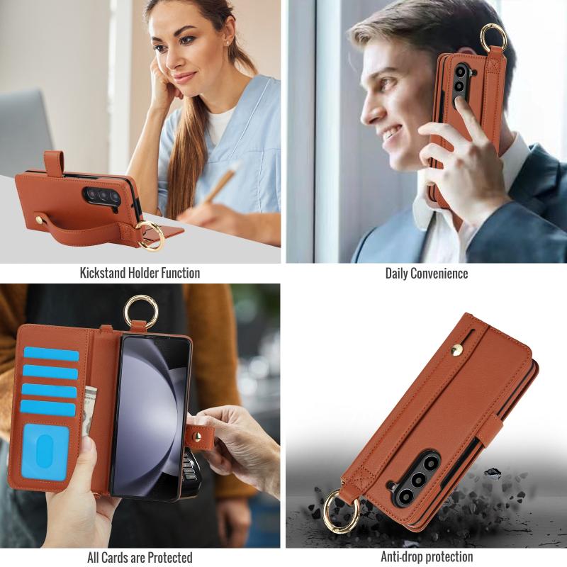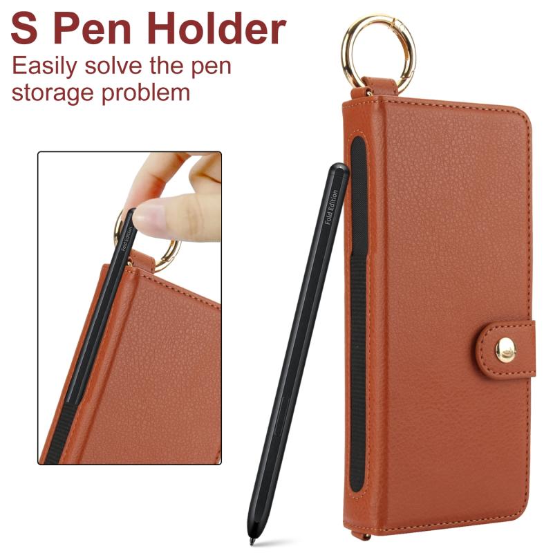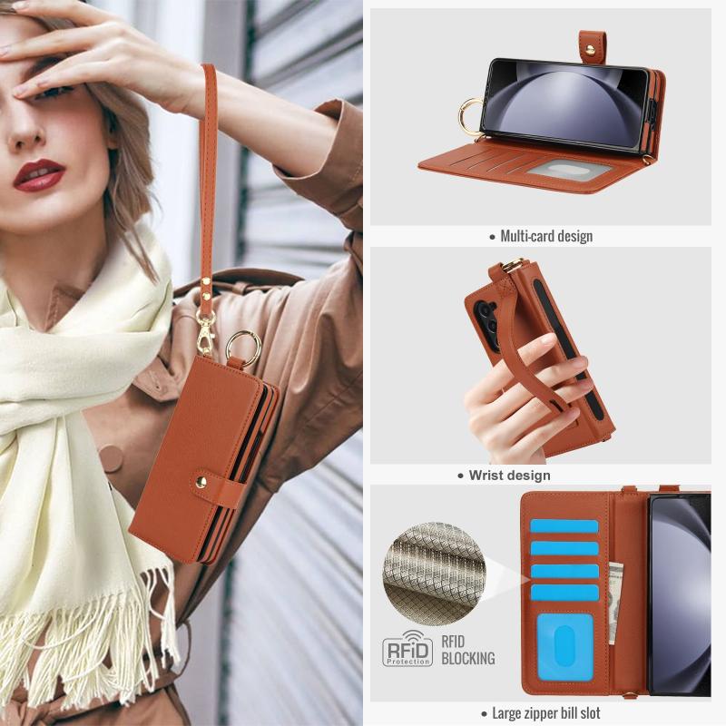 For Samsung Galaxy Z Fold6 Solid Color Wristband Ring RFID Leather Phone Case with Lanyard(Brown)