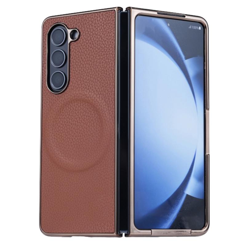 For Samsung Galaxy Z Fold6 Three Parts MagSafe Litchi Texture Fold Phone Case(Brown)