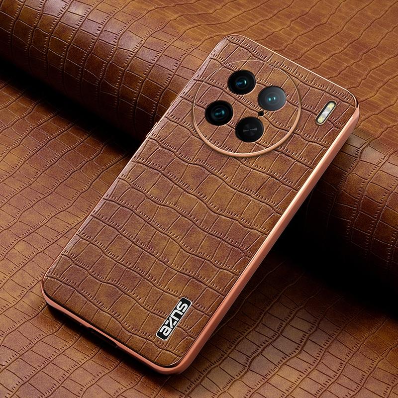 For vivo X90 Pro AZNS Electroplated Frame Crocodile Texture Full Coverage Phone Case(Brown) (AZNS)