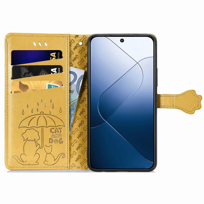 For Xiaomi 14 Pro Cat and Dog Embossed Leather Phone Case(Yellow)