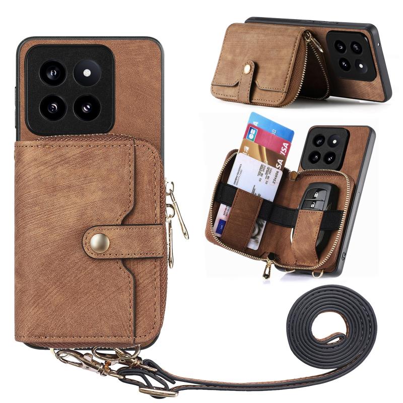 For Xiaomi 14 Pro Crossbody Multi-function Zipper Wallet Phone Case(Brown)
