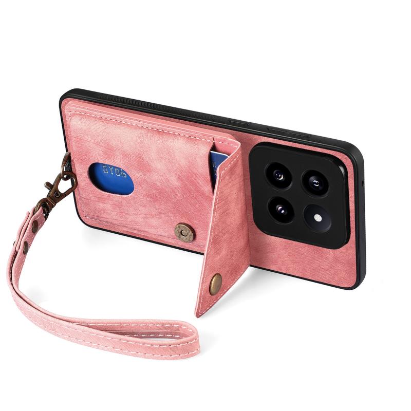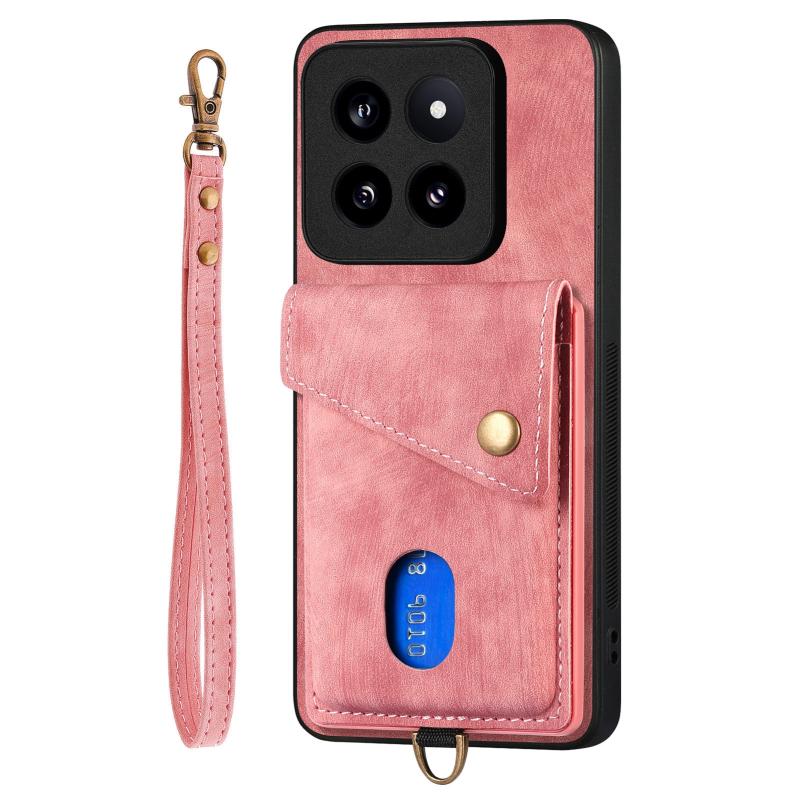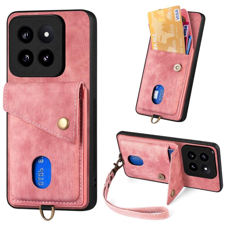 For Xiaomi 14 Pro Retro Card Wallet Fold Leather Phone Case with Strap(Pink)