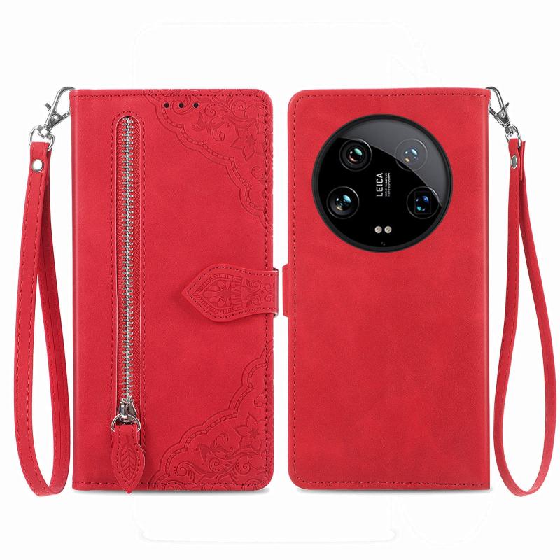 For Xiaomi 14 Ultra Embossed Flower Zipper Leather Phone Case(Red)
