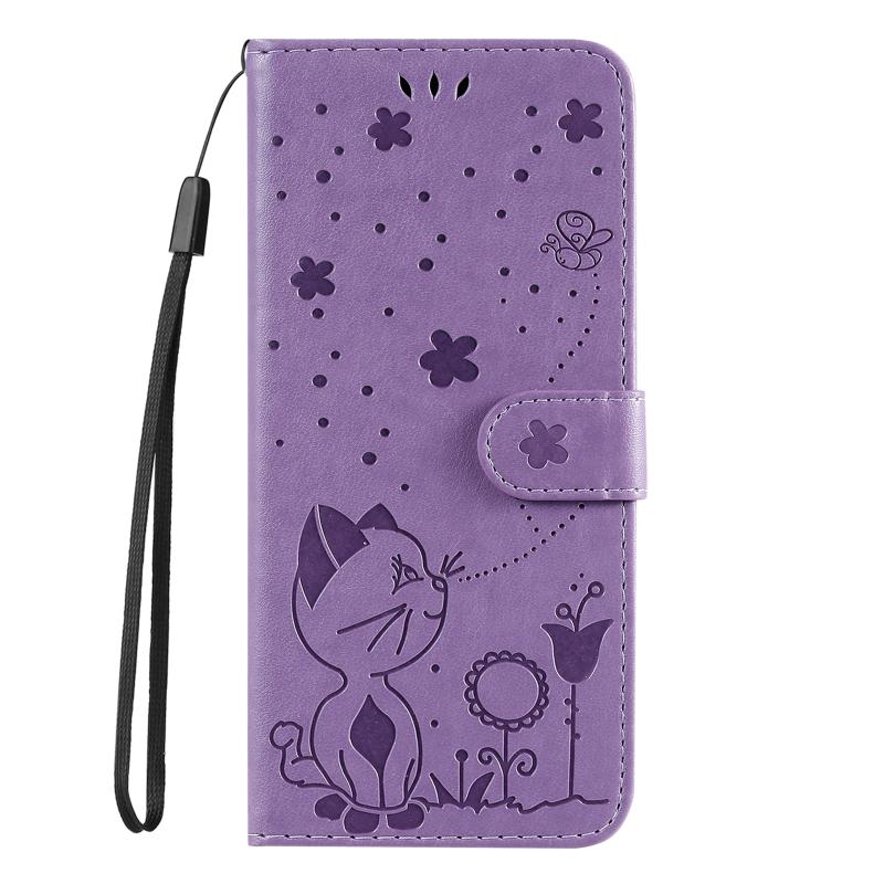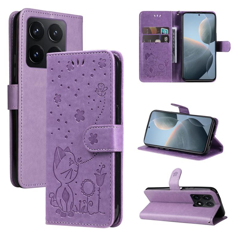 For Xiaomi 14T Cat and Bee Embossed Flip Leather Phone Case(Purple)