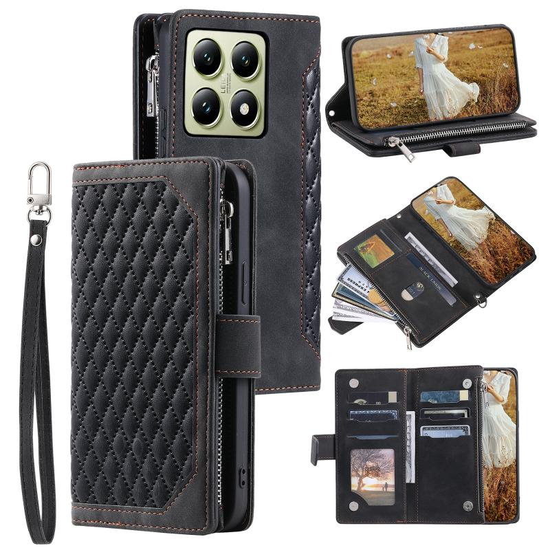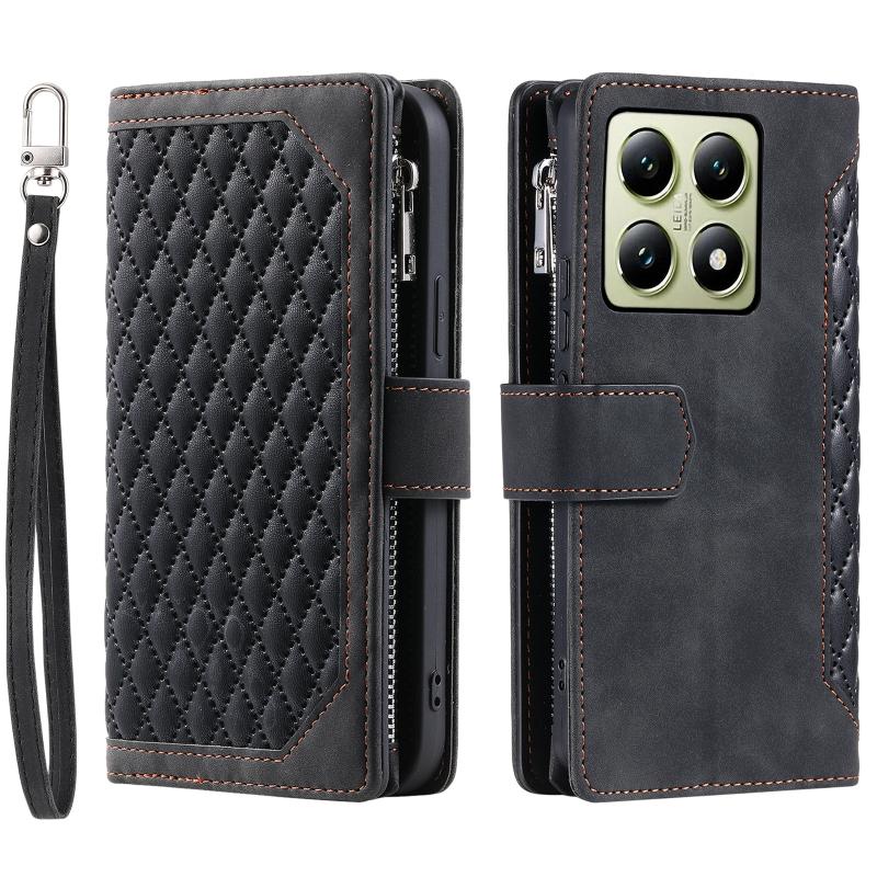 For Xiaomi 14T Pro Grid Texture Zipper Leather Phone Case with Lanyard(Black)