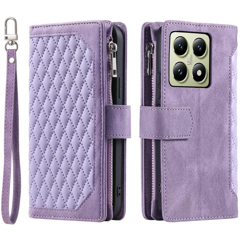 For Xiaomi 14T Pro Grid Texture Zipper Leather Phone Case with Lanyard(Purple)