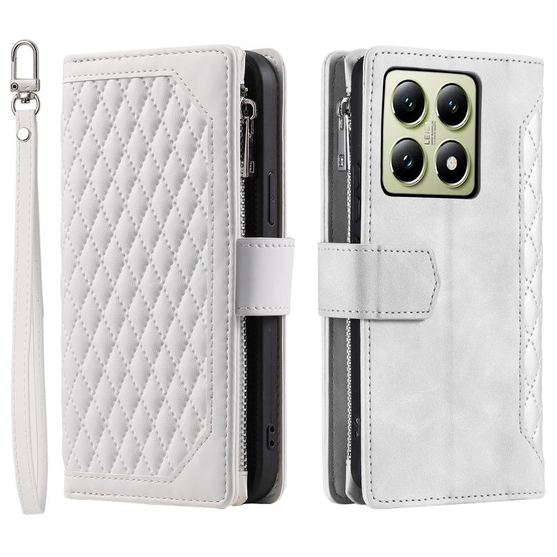 For Xiaomi 14T Pro Grid Texture Zipper Leather Phone Case with Lanyard(White)